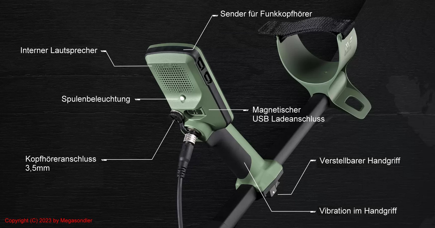 Der mit einem längenverstellbaren Teleskop-Gestänge ausgerüstete Metalldetektor ist bis 5 Meter Tauchtiefe wasserdicht und auch für den Einsatz am Meer (Salzwasser) geeignet. Unterwasser kann man sich das Ortungssignal mittels Vibration im Griff anzeigen lassen.